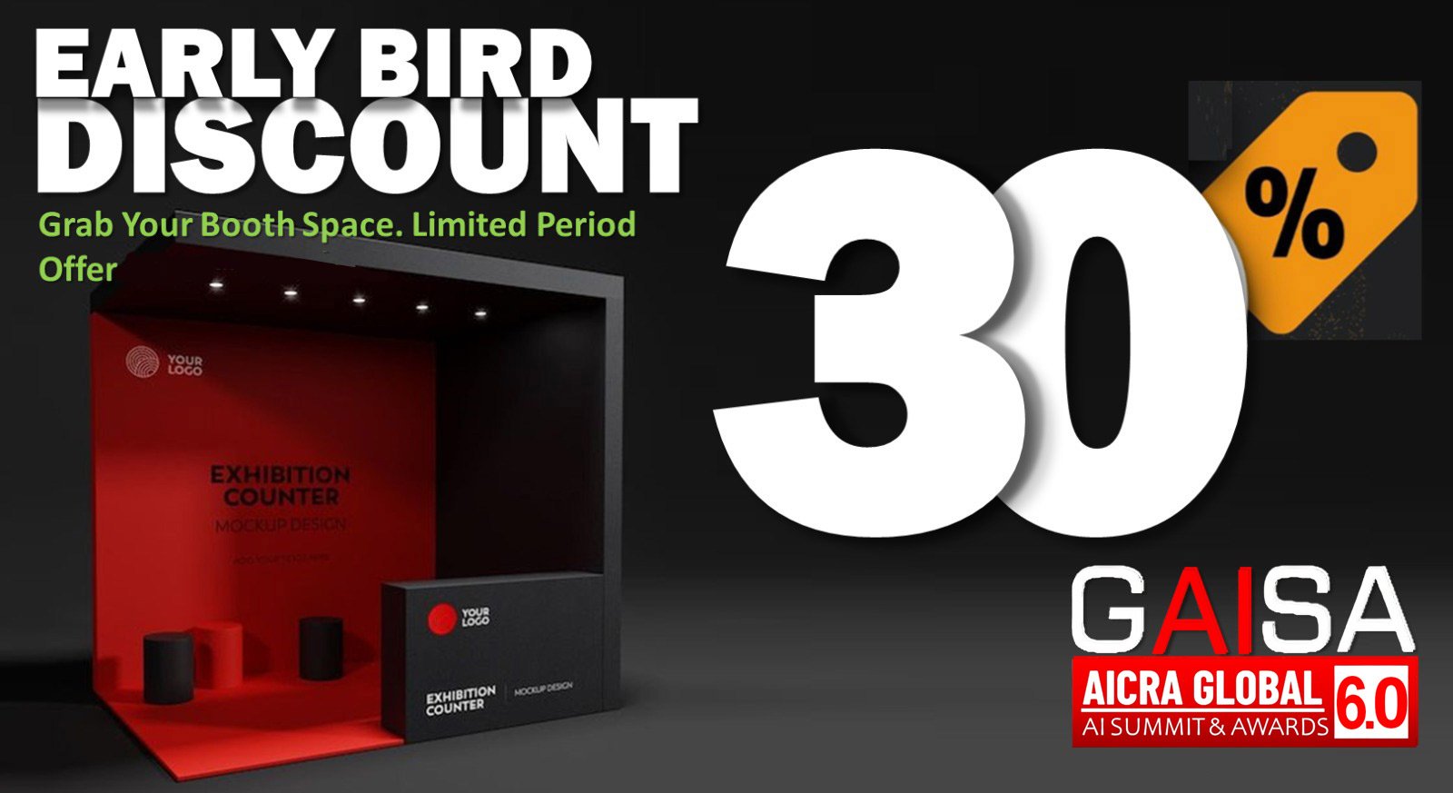 Don’t miss out on this exclusive offer—secure your exhibition space today, enjoy the 30% discount, and ensure your company stands out at GAISA 6.0. Act fast—this offer is only available for a limited time! Book now to take your brand to the next level.